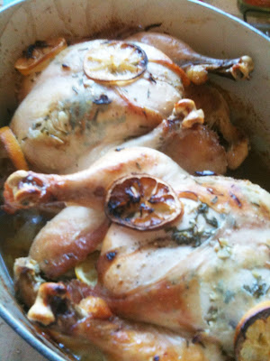 Place stuffed bird, breast side up, in medium-sized cast iron dutch oven, with lid off. Garnish top with reserved lemon slices. Pour in 1 box of chicken stock. Place pot in preheated oven. Immediately reduce oven temperature to 375 degrees. Set timer for 1 hour, 45 minutes and bake. Remove chicken from pan and let rest on a serving platter for 15 minutes and serve. Any remaining juices may be strained and used to make a light sauce, by reducing with 1/2 cup of white wine.