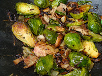 Chop and then cook 3 pieces of bacon in a skillet on low heat, until soft but not crispy. Slice and add about 15 medium-sized button mushrooms and 1 TBS butter. Saute for about 5 minutes, until mushrooms have softened and reduced. (If you choose to omit the bacon or butter, you may substitute 2 tbsp. EVOO & add a little bit more salt.) Add 12 large brussel spouts sliced in half, sliced-side down in the pan, with other ingredients covering the sprouts. Turn up heat to medium, cover and cook for about 10-12 minutes. The sliced side of sprouts will carmelize and the rest will steam. Add 1 cup chopped celery. Toss together, cook for a few minutes more until celery is just slightly soft. Lightly salt, to taste. Turn off heat, transfer to bowl and let cool to room temperature. When ready to serve, toss with 3 cups mixed field greens. Eat without dressing or toss with a light balsamic vinegar dressing. Veggie mixture may be served on its own, as well, if you prefer to omit the greens.