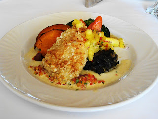 Entree: Macadmaia-crusted Mahi-Mahi topped with Hamakua Mushroom Sauce, teamed with Chicken and Pork Lau-Lau with Pineapple Lomi Salsa, Fresh Spring Vegetables & Roasted, Sliced Sweet Potato.