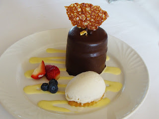 Dessert: Royal Hawaiian Signature Chocolate Ganache Cake with Creme Anglaise, Vanilla-Bean Ice Cream on a Butter Cookie and Macadamia Brittle, Gold Leaf and Berry Garnish.